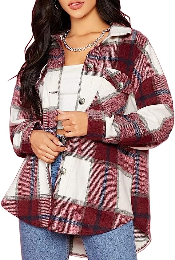 Locachy Women's Casual Plaid Button Down Wool - Burgandy - Medium