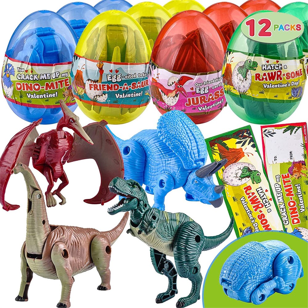 12 Pack Valentines Day Card w/Transforming Dinosaur Toys in Egg