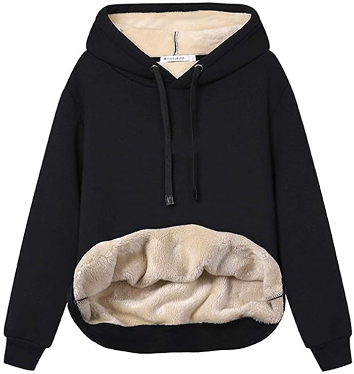Womens Casual Sherpa Lined Pullover Hooded Sweatshirt - Black - Small