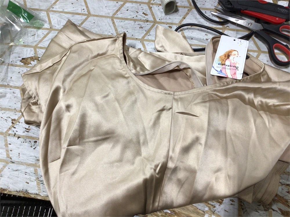PRETTYGARDE Satin Midi Dress Cap Sleeve w/ Tie Waist, Champagne, Medium