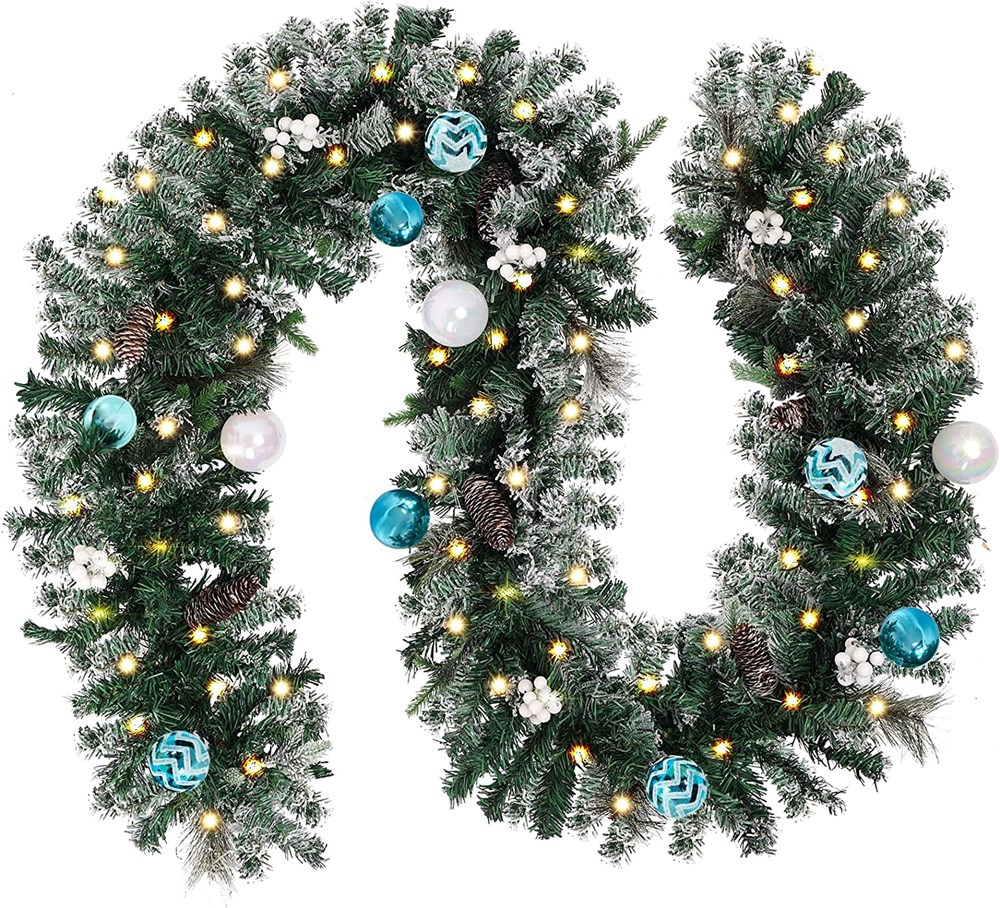 CEWOR 9ft Christmas Snow Flocked Artificial Garland w/Blue White Balls