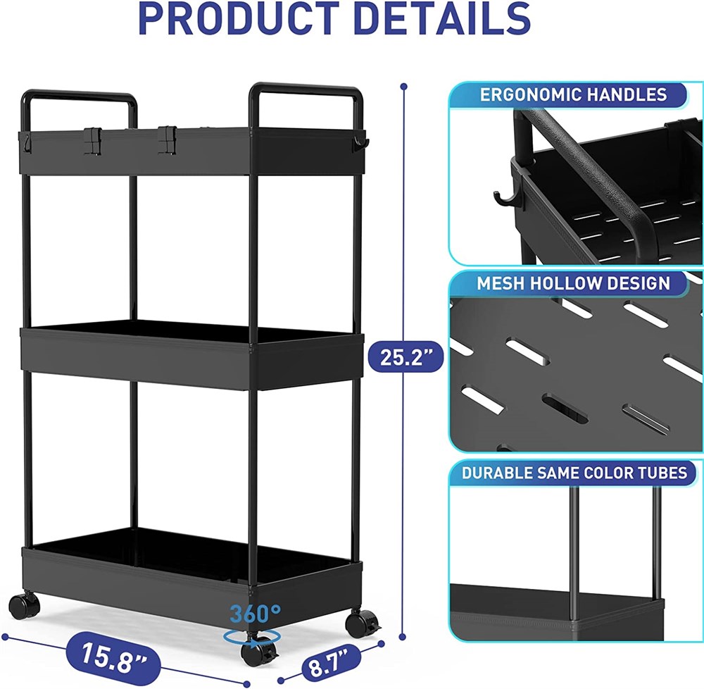 3 Tier Utility Rolling Cart with Wheels Lash Cart Organizer