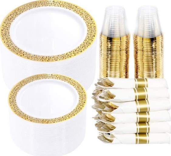 WELLIFE 350 Pieces Gold Plastic Plates with Disposable Silverware and Cups