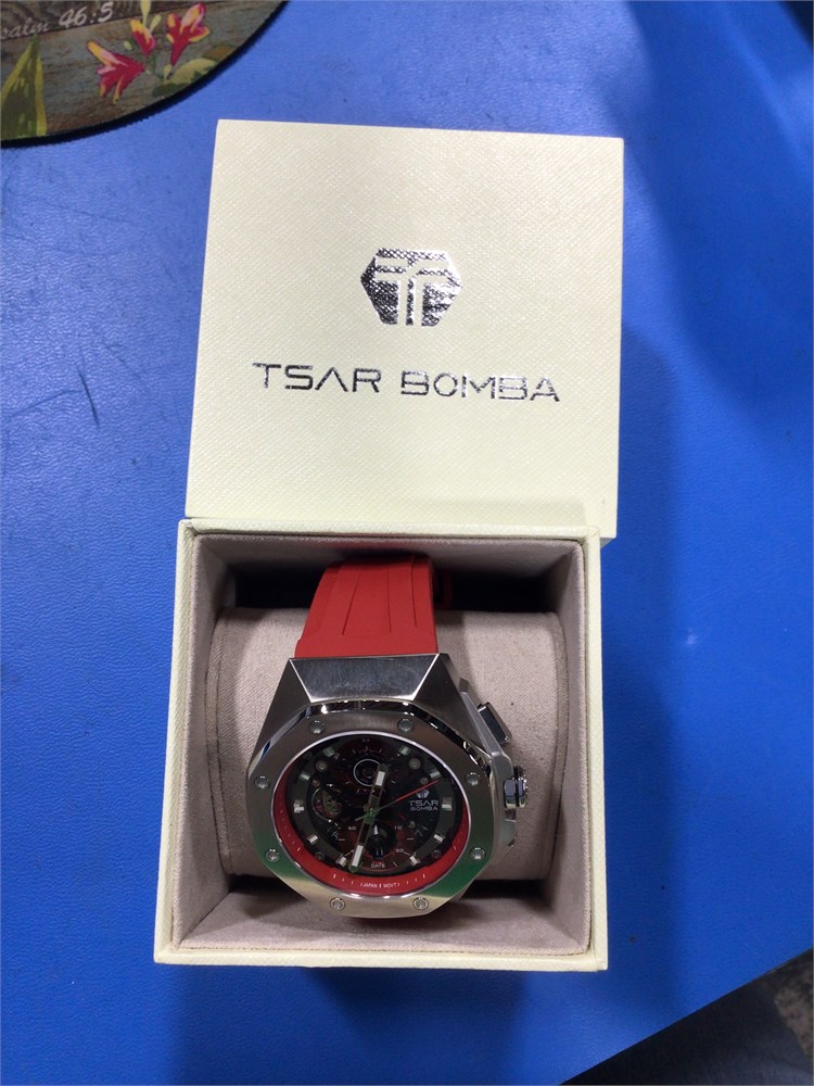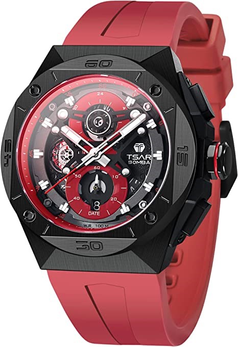 TSAR BOMBA Men's Automatic Watch, Silver Square, Red