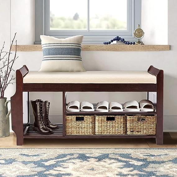 Large Shoe Bench Rack Shoe Organizer with Storage Basket & Removable Cushion